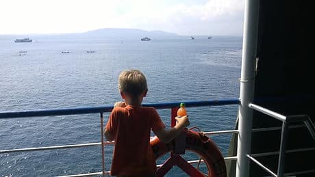 Het duurt niet lang voor we omringd zijn door dolfijnen. De kinderen vinden het fantastisch en de laaste spoortjes ochtendhumeur zijn om 6u ’s ochtends al verdwenen!